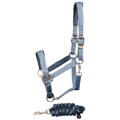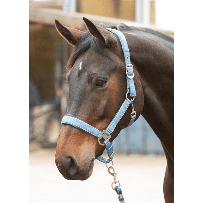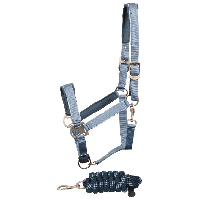 Halster met een contrasterende sierbies, met een zachte neopreen voering en is dubbel verstelbaar op het kopstuk en verstelbaar op de neus en inclusief een halstertouw van 2 meter.